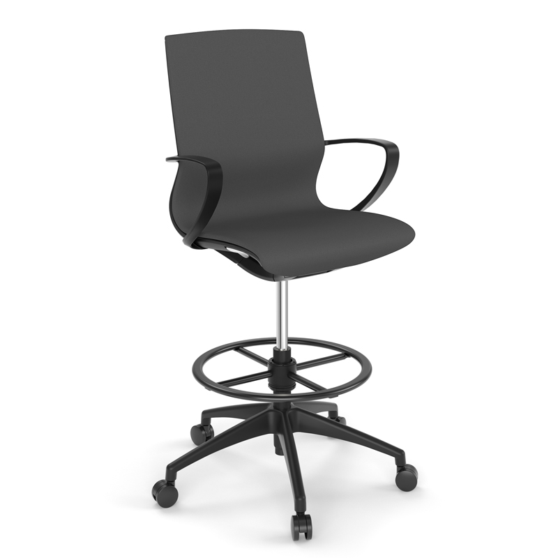 Our Marics Drafting Chair features an adjustable metal foot ring, an adjustable seat height 24"-32" high and stocked in designer gray fabric.
