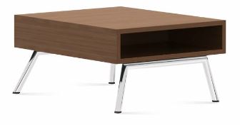 - Also available are freestanding end and coffee tables. 12" height matches height of installed bridging tables. Laminate top is 5" thick with opening on front for storage and visual recess at rear. Solid sides. Chrome tubular base.