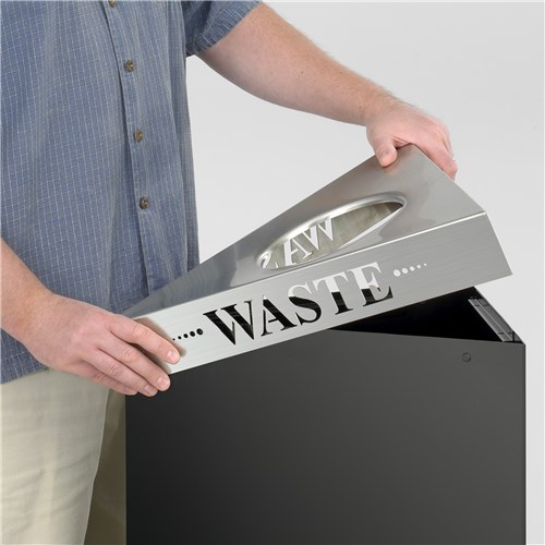 The Trifecta® waste receptacle is a 26"H, 15 gallon capacity trash can that can be used individually or in multiple units to create a waste or recycling center. The adaptable shape allows for endless configurations and fits neatly into corners. Patent no. D618415S. Base only. Lid sold separately.