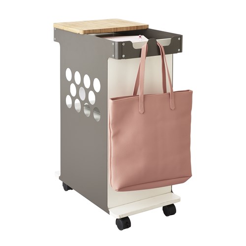 The Mini Rolling Storage Cart is a compact cart that easily fits into small spaces to provide storage and organization of personal items. It is mobile on four casters (two locking) making it easy to move within a work area or to bring with you throughout the day. The compact design is perfect for desk-side mobile storage as well as for use alongside standing or adjustable-height workstations to keep everything within easy reach. Cart handle features a hook to hang backpacks, purses, jackets, etc. for even more storage options. The stylish sliding wood top can be used as a writing space, laptop stand while on the go, or storage of a coffee cup, water bottle, or other supplies. Additionally, you can slide it to reveal additional storage space underneath for personal items. The perforated side panels create a sleek, modern look that suits any space. Great for use in small offices, home offices, open floor plans, lobbies, personal workspaces, etc.